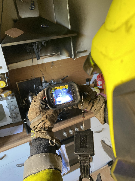 Mittels Hochleistungslüfter wurde die Wohnung Rauchfrei gemacht und der verbrannte Bereich mittels Wärmebildkamera kontrolliert.