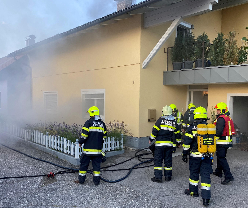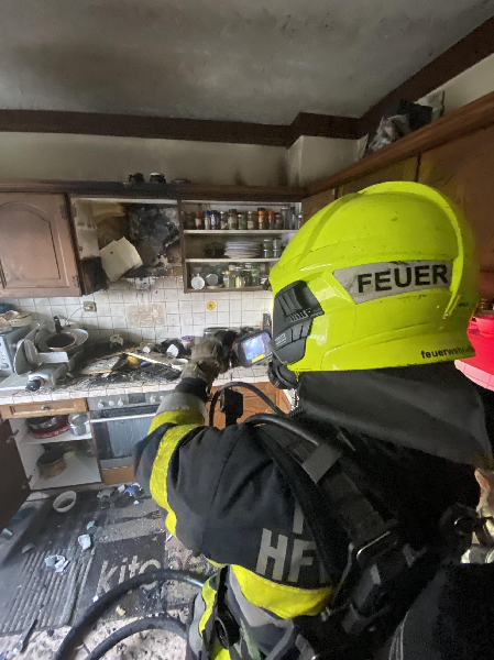 Vor Ort versuchte noch ein Feuerwehrmitglied der FF St.Magdalen mittels Handfeuerlöscher die Flammen durch das Küchenfenster des Einfamilienhauses zu bekämpfen. Er musste jedoch den Versuch abbrechen.