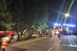 Zeitgleich wurde die Unfallstelle ausgeleuchtet, abgesichert und durch den FW-Einsatzleiter außerdem die Firma Mössler mit zwei Bergekränen zur Unterstützung angefordert.