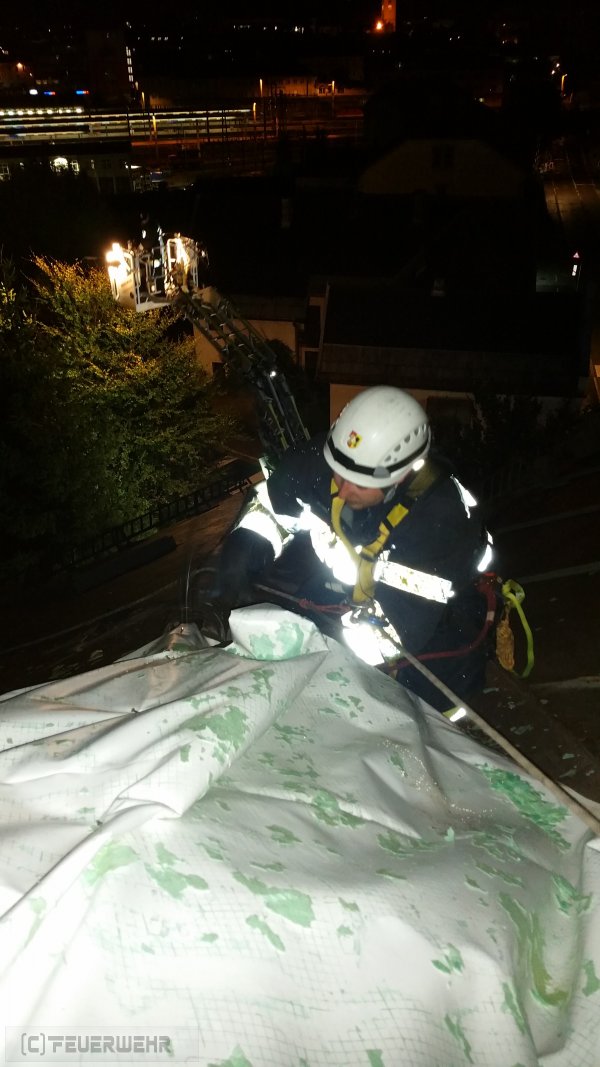 Im strömenden Regen musste ein Trupp unserer MRAS (Menschrettung -Absturzsicherung) Mannschaft angeleint über die Drehleiter Planen am Dach, in rund 15 Meter höhe.