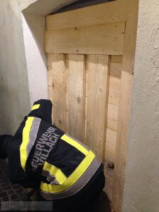 Nach kurzer Erkundung wurde die Auslage, mittels einer Plane sowie mehreren Holzbrettern, notdürftig verschlossen um ein Einsteigen in das Geschäft zu verhindern.