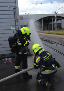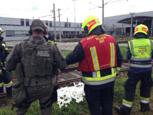 In weiterer Folge wurden weitere Kühlung Maßnahmen durchgeführt.  Mit dem Standortleiter der ÖBB vor Ort wurde die abschließenden Maßnahmen besprochen und die  Flasche dann zur Sicherheit in einem durch die ÖBB bereitgestellten Wasserbehälter eingelegt.  Der Besitzer der Gasflasche wird sich um den weiteren Transport zur Entsorgung kümmern.  Parallel dazu wurde der Bereich sowie die angrenzende Halle mittels Mehrgasmessgerät kontrolliert um eine gefährliche Schadstoffkonzentration auszuschließen.