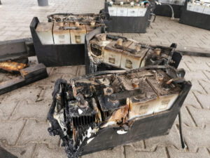 Die verbrannten Batterien wurden nach dem Ablöschen durch die Feuerwehr ausgebaut und in zwei mit Wasser gefüllten Wannen zur weiteren Kühlung eingelegt und gesichert am ÖBB Gelände abgestellt.
