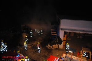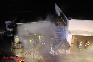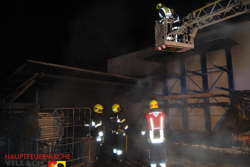 Unverzügliche wurde die Hauptfeuerwache Villach gemeinsam mit der FF Perau und der FF Vassach alarmiert. Ein Tanklöschfahrzeug der Hauptfeuerwache befand sich gerade am Rückweg eines Einsatzes und fuhr unverzüglich den Brandort an. Beim Eintreffen der ersten Kräfte brannte der Holzlagerplatz am hinteren Teil des Gebäudes bereits vollständig. Sofort wurde mehrere Löschleitungen unter schwerem Atemschutz vorgenommen um ein Übergreifen des Feuers auf den angrenzenden Tischlereibereich zu verhindern.