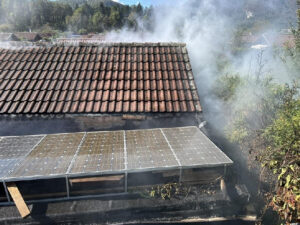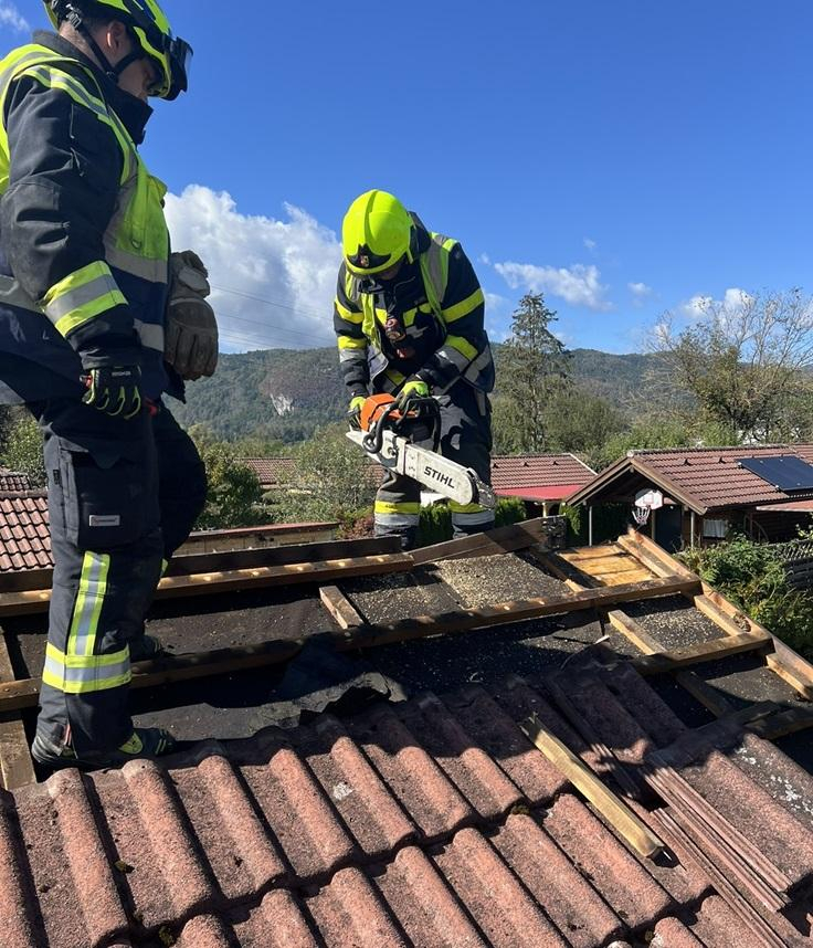 „Im Zuge der Kontrolle mittels Wärmebildkamera wurden mehrere Glutnester im Dach und in den Wänden der Hütte festgestellt. "In schweißtreibender Arbeit mussten die Feuerwehrkräfte diese Bereiche mittels Rettungssägen öffnen und ablöschen".