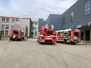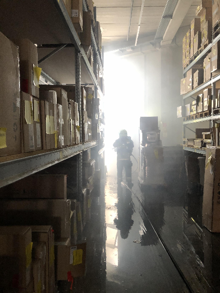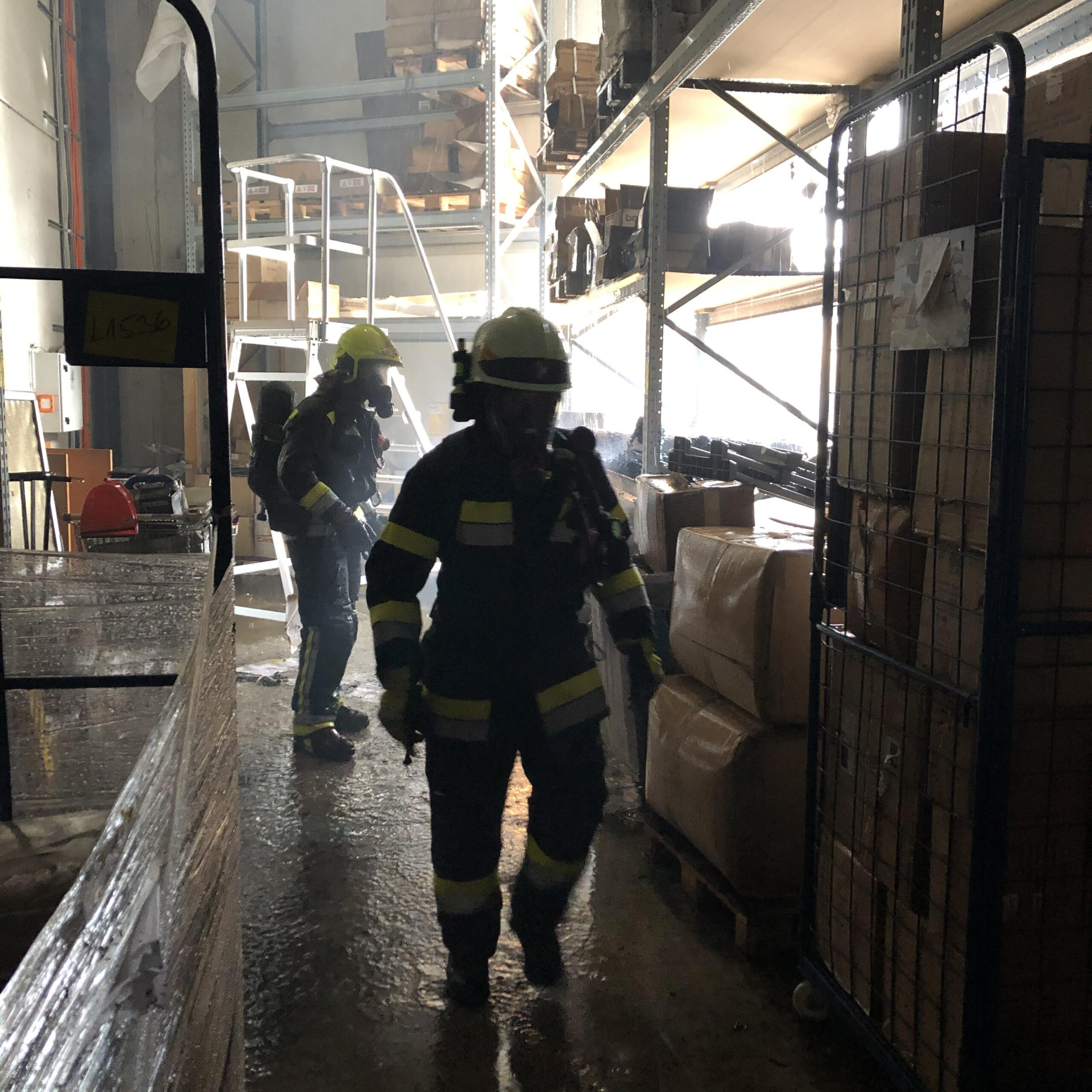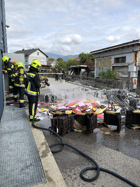 Im weiteren Einsatzverlauf wurde unter Atemschutz das gesamte Brandgut aus der Halle getragen und kleinweise unter Sprühstrahl abgelöscht. Das abgebrannte Material wurde im Anschluss durch betriebsinternes Personal in einem Abfallcontainer zum Abtransport verladen.