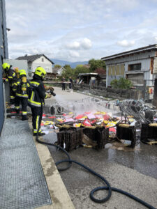 Nach Abschluss der Brandbekämpfung wurde mit mehreren Nasssaugern das Löschwasser der Sprinkleranlage abgesaugt. Diese hat sich über den Großteil des Lages, in Teile des Verkaufsraumes bis in den darunterliegenden Keller verteilt. Auch ein gefluteter Liftschacht musste abgepumpt werden.
