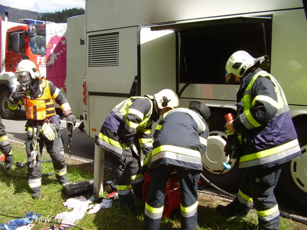 Beim Eintreffen wurde festgestellt, dass ein mit 57 Personen besetzter Reisebus im Bereich des Motorraumes Feuer gefangen hat und dieses auf den Fahrgastraum überzugreifen drohte.