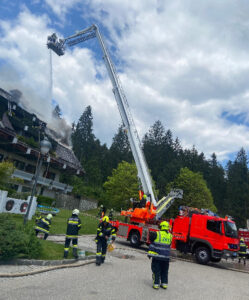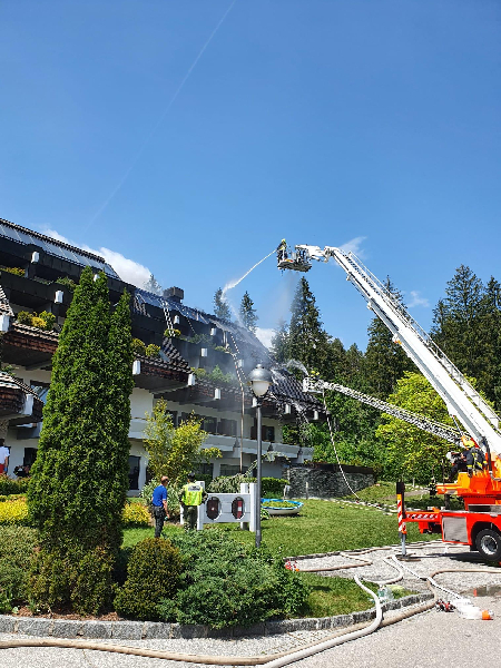 Als wir am Einsatzort eintrafen, konnte bereits ein offener Dachstuhlbrand im Bereich der Ostflanke des Hotels ausgemacht werden. Durch die bereits anwesenden Feuerwehren wurde bereits vorab der Parkplatz von privaten Fahrzeugen geräumt, um Platz für unsere Hubrettungsgeräte zu schaffen, sowie erste Löschleitungen zur Brandbekämpfung vorgenommen.
