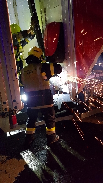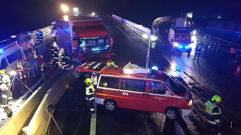 Beim Eintreffen konnte festgestellt werden, dass es eine Kollision zwischen einem LKW und einem PKW gegeben hat. Sofort wurden Rettungsmaßnahmen getroffen um die zwei schwerverletzen Personen mittels hydraulischem Rettungssatz und Bergebrett aus dem Fahrzeug befreit. Zusätzlich wurde der LKW welcher auf einem Aufpralldämpfer zu stehen kam in seiner Lage stabilisiert, die Unfallstelle abgesichert und ein Brandschutz aufgebaut.