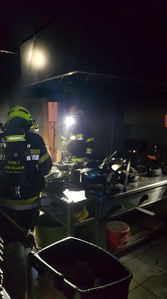 Im Zuge der weiteren Erkundung konnte festgestellt werden, dass im Küchenbereich die Flammen bereits erstickt waren, jedoch der Küchen- und hintere Lokalbereich stark verraucht war. Die Gaszufuhr für die Küche wurde sofort abgedreht.