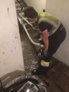 Unmittelbar danach erforderte ein Wasserrohrbruch in einem Mehrparteien Haus den Einsatz unsere Mannschaft. Bei der Hauptwasserzuleitung des Hauses kam es aus nicht geklärter Ursache zu einem Defekt. Bei Eintreffen der Kräfte der Hauptfeuerwache war der gesamte, rund 100 m² große Kellerbereich schon rund 30 cm unter Wasser.