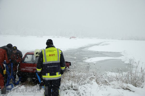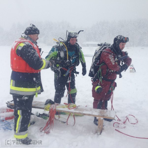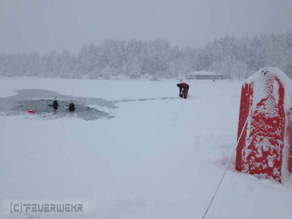 Die Einbruchstelle lag in der Mitte des Sees. Feuerwehrtaucher konnten das Fahrzeug in ca. fünf Metern unter Wasser sichten und gegen weiteres abtreiben sichern.