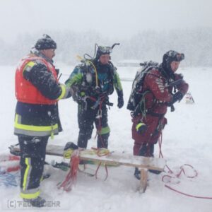 Aufgrund der schlechten Sichtverhältnisse kam er ca. 30 Meter östlich der Spur auf dünneres Eis und das Fahrzeug brach sofort ein. Im letzten Moment konnte sich der Mann über die offene Seitenscheibe retten.