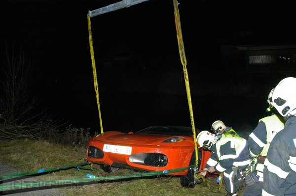Der verunfallte Sportwagen wurde durch die FF Velden mittels Seilwinde und Kran aus dem Teich geborgen. Die eingesetzten Taucher unterstützten dabei die Bergung.