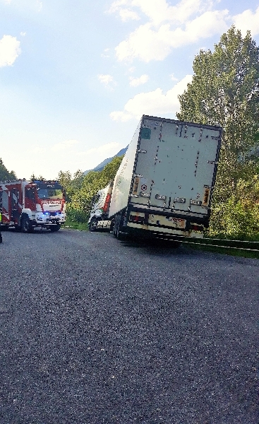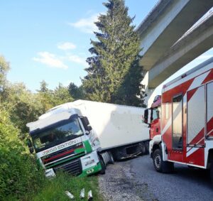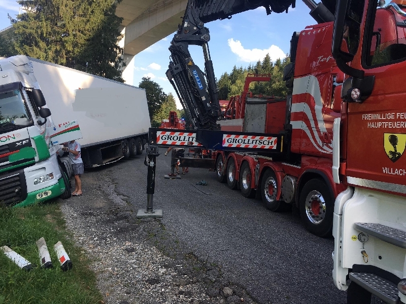 Kurz nach 15 Uhr 30 teilte der Einsatzzentrale Villach ein Pannenfahrer über den Feuerwehrnotruf mit, das ein Sattelzug am Parkplatz auf der B100 Drautalbundestraße kurz vor der Stadtgrenze über die Straßenböschung abzustürzen drohe. Sofort wurde Alarmstufe 2 für den Rüstzug der Hauptfeuerwache Villach sowie für die örtlich zuständige FF Fellach und die FF Vassach ausgelöst. Als wir mit unserem schweren Kranfahrzeug sowie dem Rüstlöschfahrzeug eintrafen wurde unverzüglich der Sattelzug von zwei Seiten mittels Stahlseile bzw. Ketten gegen weiteres abstürzten gesichert. Wie lange das Erdreich unter den Rädern das Gewicht noch gehalten hätte, kann man hier nicht abschätzen. Unter der Straßenböschung fließt in rund 30 Metern Entfernung die Drau an der Bundestrasse vorbei. Glücklicherweise war der LKW nicht beladen und so musste nur das Eigengewicht zurückgehalten werden so Einsatzleiter HBI Harald Geissler, Kommandant der Hauptfeuerwache Villach.