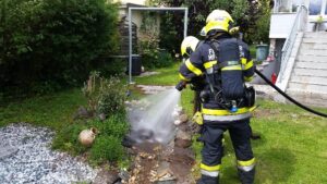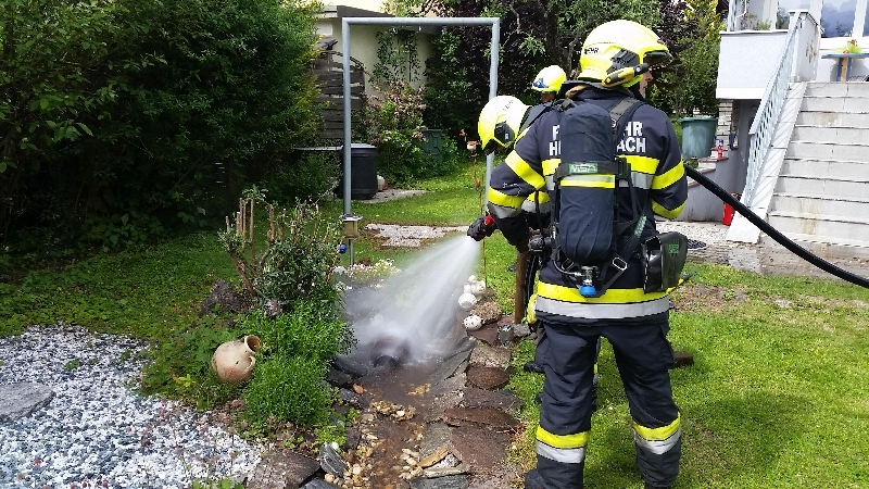 Ein Trupp konnte mittels einer Hochdrucklöschleitung die Flammen rasch bekämpfen und die Flasche umgehend kühlen. Die Temperatur der Flasche wurde mittels Wärmebildkamera kontrolliert.Zur weiteren Kühlung wurde die überhitze Flasche ins Wasser eines Biotops am Grundstück gelegt.