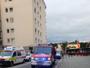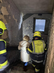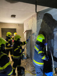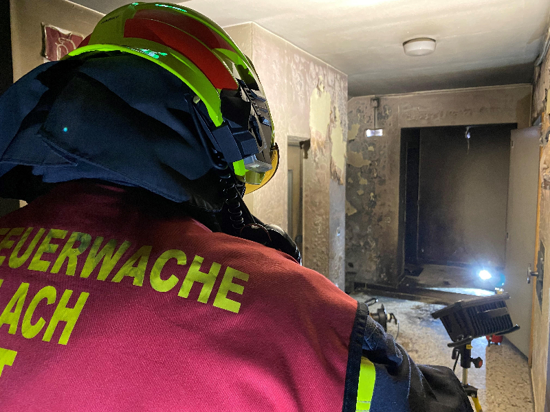 Im ersten Stock erfassten die Flammen bereits eine Wohnung. Eine Kameradin der Feuerwehrjugend der Hauptfeuerwache, welche dort wohnhaft war, hörte einen Knall und weckte ihren Vater. Gemeinsam löschten sie die Flammen im Vorraum der Wohnung mittels Feuerlöscher.