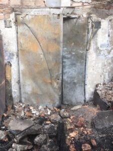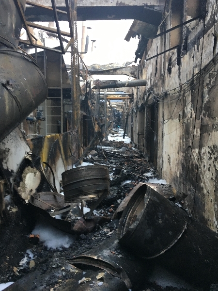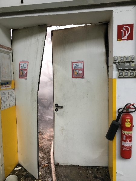 Zu diesem Zeitpunkt war das taktische Hauptaugenmerk darauf ausgelegt das Feuer im Ausbruchsbrandabschnitt zu halten. An der nördlichen Grenze der Ofenhalle wurde mit einem entschlossenen Löschangriff eine Brandschutztüre gesichert, die von herabfallenden Trümmern teilweise aus ihrer Verankerung gerissen wurde und den Flammen nicht mehr standhielt.