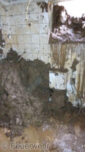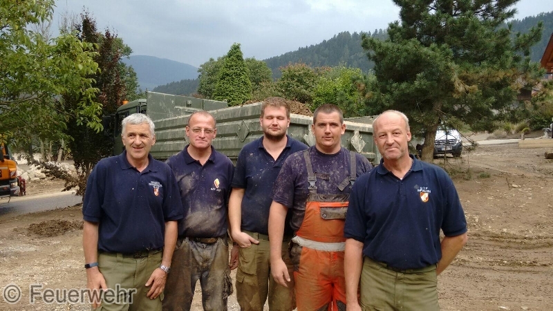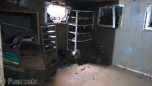 Auch die Hauptfeuerwache Villach unterstützte die Einsatzkräfte in Afritz. Einerseits mit Gerätschaften aus dem KAT-Lager Villach, andererseits mit Mannschaft und Spezialgerät. 4 Tage standen unsere Kameraden im Einsatz, um bei einem der letzten betroffenen Keller die Geröllmassen zu entfernen. Da hier der Heizraum massiv in Mitleidenschaft gezogen wurde, Heizöldämpfe vorhanden waren und eine natürliche Luftumwälzung durch bis zur Decke gefüllte Schlammmassen nicht gegeben war, mussten die Kameraden mit Atemschutz diese Tätigkeiten durchführen. Es wurden pernament Gasmessungen durchgeführt. Die Schadstoffe wurden mittels Be- & Entlüftungsgerät abgesaugt. Die kontaminierten Geröllmassen konnten nur mittels Eimerkette ins Freie verfrachtet werden.