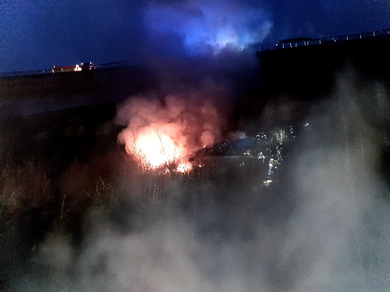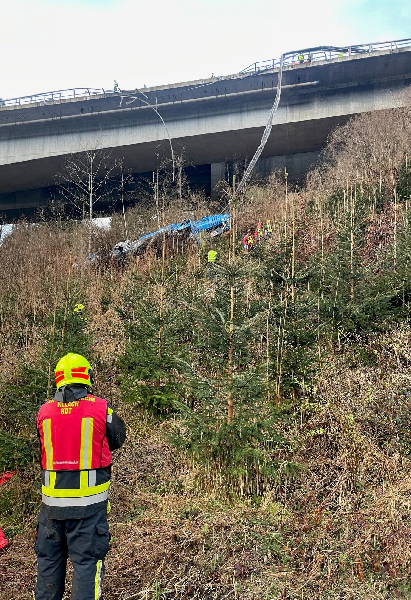 Kranwagen stürzt von Autobahnbrücke und brennt.