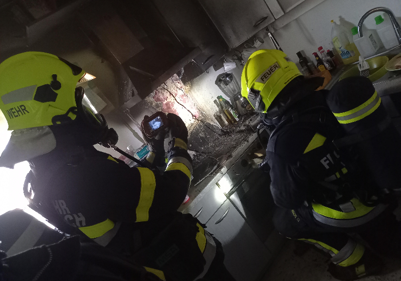 Mit schweren Atemschutz drang ein Atemschutztrupp in die stark verrauchte Wohnung vor nahm Nachlöscharbeiten vor. Mittels Wärmebildkamera wurde die Brandstelle kontrolliert, sowie die verkohlte Küchenausstattung entfernt. Mit mehreren Elektrischen Hochleistungslüftern wurde der Rauch, welcher sich bereits im Stiegenhaus über mehrere Geschosse verteilt hatte, ausgeblasen.
