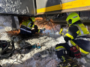 „Außerdem mussten durch die Feuerwehr mittels Trennschleifer und Säbelsäge die verkeilten Teile der Leitschiene unter dem Sattelanhänger abgeschnitten und mit dem Greifzug herausgezogen werden. Des Weiteren wurden die losen Teile von der Straße unter der Brücke entfernt.“