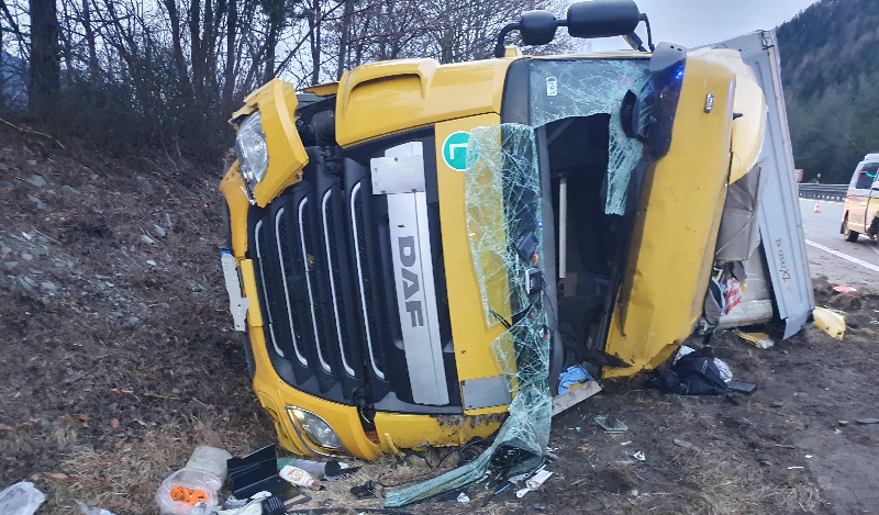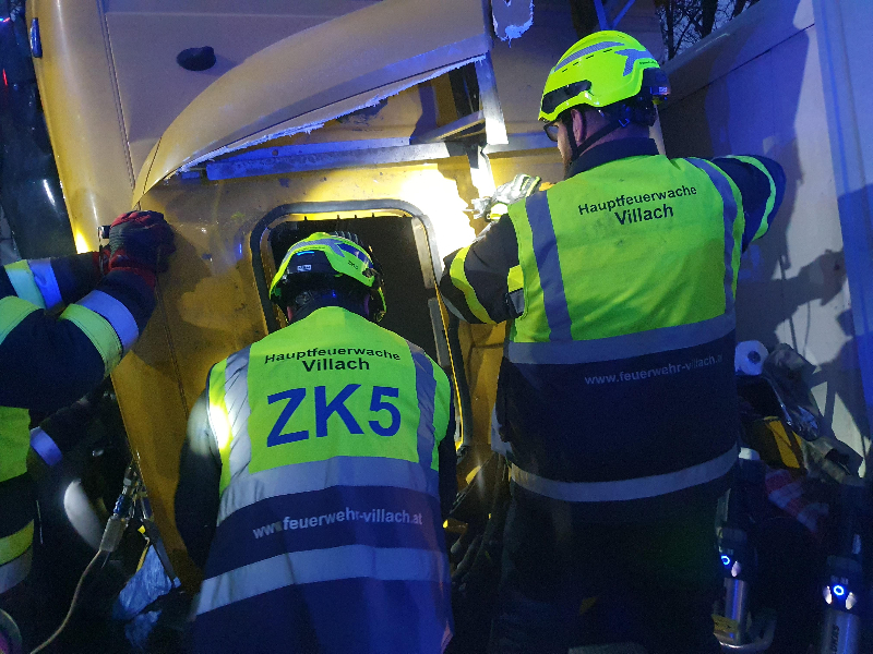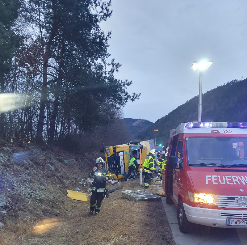 Kurz nach 06:00 Uhr morgens wurde die Hauptfeuerwache Villach gemeinsam mit der Freiwilligen Feuerwehr Töplitsch und Feistritz Drau, zu einem schweren LKW Unfall auf der A10 Tauernautobahn kurz nach der Raststation Feistritz in Fahrtrichtung Salzburg alarmiert. Aus noch unbekannter Ursache kam ein LKW-Sattelzug von der Fahrbahn ab, kam auf die Straßenböschung und kippte um. Der LKW kam auf der Fahrerseite zu liegen und der Lenker wurde im Bereich des linken Armes unter der Kabine eingeklemmt.