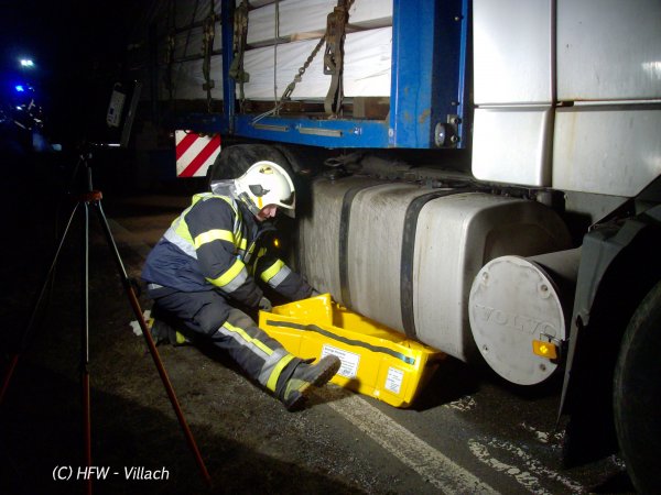 Kurz nach 22:30 wurde  die Hauptfeuerwache Villach von der Polizei von einem LKW Unfall mit Massiven Treibstoff Austritt im Bereich Villach Warmbad auf der Kärntner Bundesstrasse in Kenntnis gesetzt.