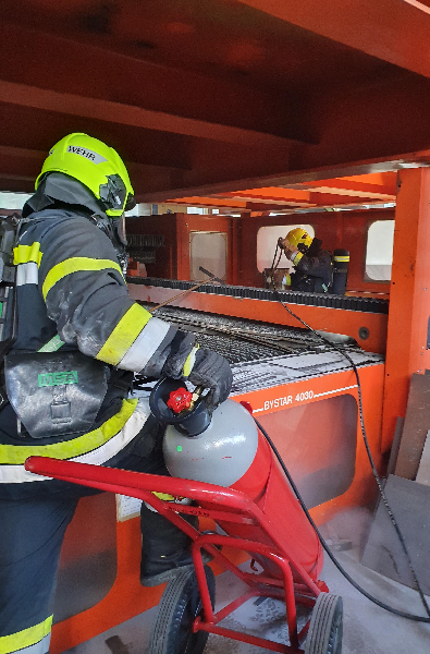 In einem Werkshallen Gebäude war eine große Schneidemaschine für Metallplatten aus noch unbekannter Ursache mit daraus resultierender starker Rauchentwicklung in Brand geraten.