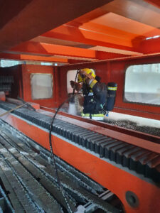 Die Anlage wurde stromlos gemacht, um ein gefahrloses Arbeiten für die Feuerwehr zu gewährleisten. Durch einen Atemschutztrupp wurde die Brandstelle vorsorglich noch mit einem 50 kg CO2 Feuerlöscher gänzlich abgelöscht und die teilweisen noch heißen Metallteile abgekühlt. Mittels Wärmebildkamera wurde die Brandstelle weiter untersucht.