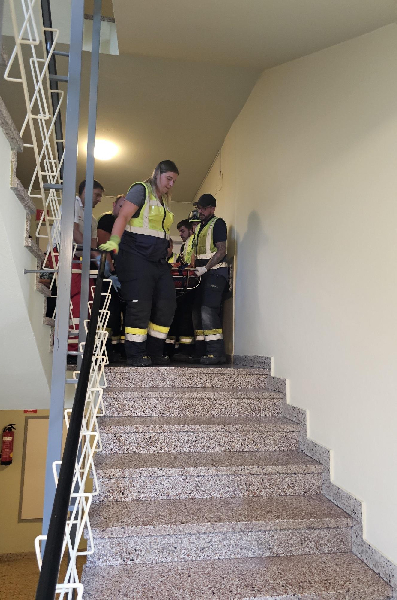 Nach Erstversorgung und Stabilisierung der Dame durch die Notärztin, wurde zuerst eine Rettung mittels Hubsteiger aus dem 3. OG des Mehrparteienhauses über den Balkon überlegt. Da das Stiegenhaus aber die notwendige Breite aufwies, konnte die Patientin mit vereinten Kräften in eine spezielle Schwerlasttrage gebettet und zum Rettungswagen getragen werden.
