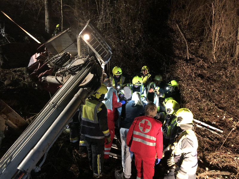 Als der Rüstzug der Hauptfeuerwache am Einsatzort eintraf konnte nach kurzer Erkundung festgestellt werden, dass im Bereich eines Wohnhauses ein Bagger rund 15 Meter einen steile Waldböschung hinuntergestürzt war und der Lenker im Führerhaus schwer eingeklemmt wurde.