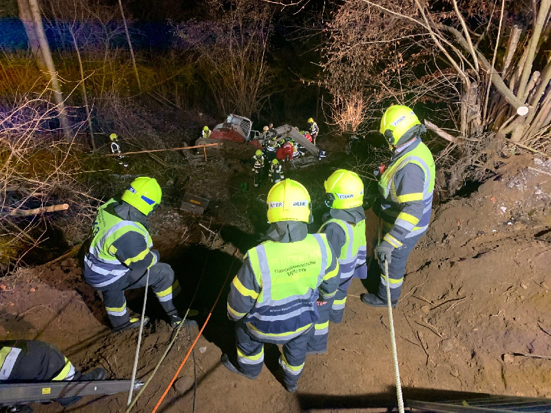 Unverzüglich wurde der Bagger, welcher seitlich zu liegen kam, mittels Greifzug gegen weiteres Abstürzen gesichert und die Unfallstelle großflächig ausgeleuchtet. Nach der Erstversorgung des eingeklemmten Lenkers durch den Notarzt des Roten Kreuzes wurde mittels mehren hydraulischen Rettungsgeräten der Lenker aus dem stark deformierten Führerhaus befreit.