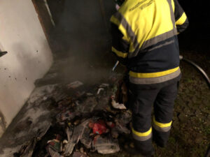 Durch das beherzte Eingreifen des Besitzers und eines Nachbarn mittels Handfeuerlöschern konnte ein Übergreifen des Feuers auf die angrenzende Garage noch vor unserem Eintreffen verhindert werden. Es mussten lediglich Nachlöscharbeiten und Kontrolltätigkeiten unter Zuhilfenahme einer Löschleitung und einer Wärmebildkamera durchgeführt werden. Die Brandursache ist derzeit noch unklar und wird von der Polizei ermittelt.