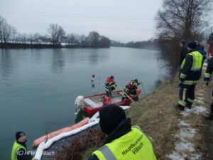 Nach der Ersterkundung wurde sofort im Bereich der Austrittstelle eine Öl Sperre errichte, ein Boot zu Wasser gebracht und der Schadstoff mittels Bioversal gebunden.