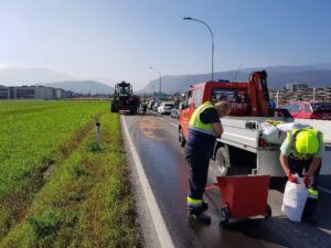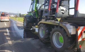 Fast zeitgleich trat bei einer Forstmaschine auf der Bruno Kreisky Straße vermutlich durch eine Defekt ebenfalls Hydrauliköl aus. Weitere Kräfte der Hauptfeuerwache rückten unverzüglich aus. Am Einsatzort konnte festgestellt werde das bereits eine größere Menge Öl ausgetreten war und die Fahrbahn bereits auf einer Länge von rund 400 Meter verunreinigt war. Sofort wurde der betroffen Fahrstreifen durch die Polizei gesperrt sowie und weitere Feuerwehrkräfte angefordert. Eine größere Menge Bindemittel musste per Hand auf die Fahrbahn aufgetragen werden um eine weitere Ausbreitung zu verhindern. Unterstützt wurden wir dabei von der FF Perau sowie der FF Drobollach welche gerade auf der Rückfahrt von der Autobahn befand.
