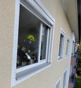 Als wir mit unserem Löschzug am Einsatzort eintrafen, wurde ein Rauchaustritt aus mehreren Fenstern wahrgenommen. Da nicht zweifelsfrei feststand, ob sich noch Personen in der Wohnung aufhielten, wurde die Eingangstür gewaltsam geöffnet und ein Atemschutztrupp der Hauptfeuerwache Villach durchsuchte die bereits stark verqualmte Wohnung.