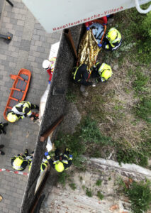 Für die Rettung aus dem nur schwer zugänglichen Bereich, direkt neben einer tiefen verwachsenden Grube, wurde nach Erstversorgung der Sanitäter die Drehleiter in Stellung gebracht. Anschließend wurde der Patient in eine sogenannte Schleifkorbtrage gelegt. Um einen schnelleren Abtransport zu gewährleisten, entschied der Einsatzleiter die Holzwand zur nahe gelegen Straße mittels Motorsäge aufzuschneiden und den Patienten so direkt zum Rettungswagen zu übergeben.