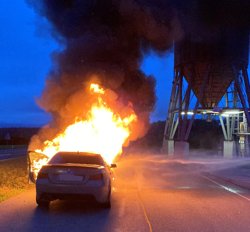 Aus noch nicht geklärter Ursache fing das Fahrzeug am Parkplatz neben der Bundesstraße Feuer.