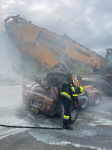 Ein mit einem Bagger beladener Tieflader hatte im Tunnel einen beginnenden Reifenbrand am Anhänger.