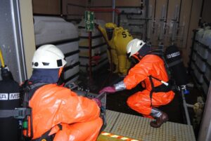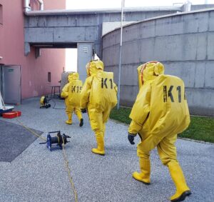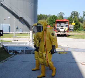 Diese Arbeiten waren extrem anstrengend weil während der ganzen Zeit spezielle Chemieschutzbekleidung mit schwerem Atemschutz getragen werden musste.