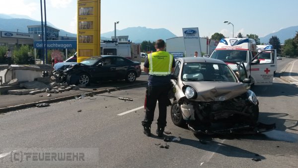 2 PKW's waren aus noch unbekannter Ursache auf der geraden Straße frontal zusammen gestoßen. Ein Fahrzeug wurde durch die Wucht des Aufpralles gegen die Tankstelleneinrichtung neben der Fahrbahn geschleudert. Glücklicherweise wurde der PKW durch eine angrenzende Mauer, welche komplett zerstört wurde..