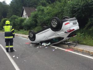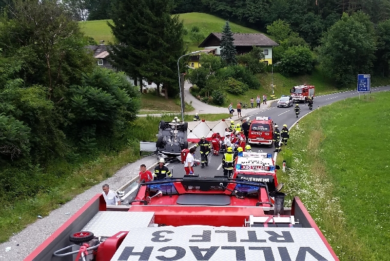 Aus noch unbekannter Ursache kollidiert ein Wohnmobil mit einem PKW auf der Bundestraße im Ortsteil Grossattel seitlich miteinander. Aufgrund des Aufpralles überschlug sich der PKW und blieb am Dach liegen. Der Lenker kam mit dem Oberkörper durch die Seitenscheibe auf der Fahrbahn zu liegen und wurde schwer verletz. Glücklicherweise wurde er dabei nicht unter dem Fahrzeug eingeklemmt.Nach notärztlicher Versorgung des Lenkers wurde dieser geborgen und ins LKH Villach eingeliefert.
