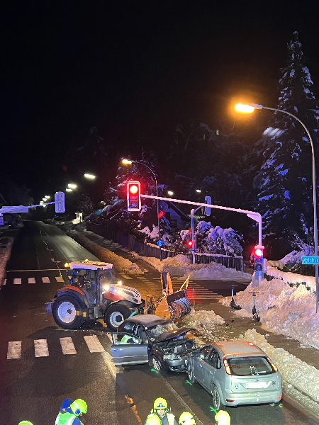Zu einem schweren Verkehrsunfall mit eingeklemmter Person wurde die Hauptfeuerwache Villach gemeinsam mit der örtlich zuständigen Feuerwehr Pogöriach gegen 19:46 Uhr alarmiert. Im Kreuzungsbereich der B86 Tirolerstraße zur Pogöriacherstraße kollidierte ein PKW mit einem Traktor. Ein weiteres Fahrzeug konnte eine Kollision gerade noch verhindern und kam rechtzeitig zum Stillstand.