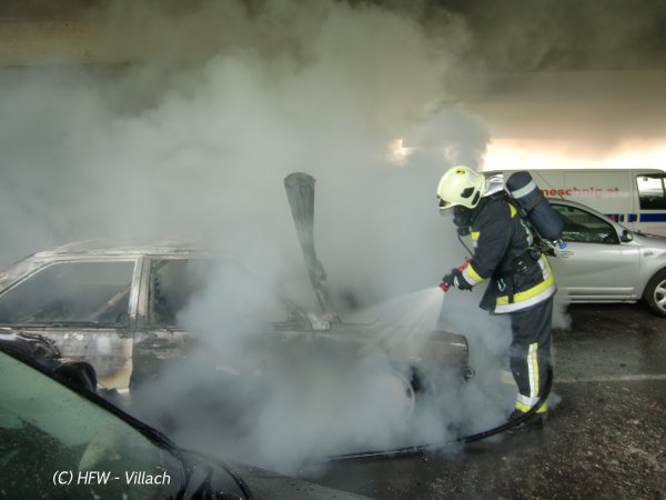 Zwei weitere PKW's die daneben abgestellt waren, wurden ebenfalls in Mitleidenschaft gezogen. Verletzt wurde glücklicherweise niemand, die Hauptfeuerwache Villach konnte nach einer Stunde wieder einrücken.