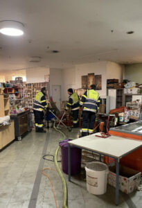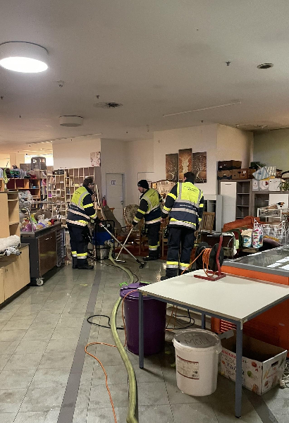 Nachdem „Brand Aus“ gegeben wurde, wurde das Wasser der Sprinkleranlage, welches sich am Boden ausgebreitet hatte, mittels zwei Wasserstaubsaugern entfernt.