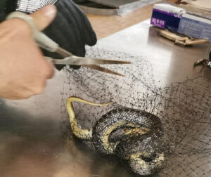 Die Schlange hatte sich in ein Netz so unglücklich verfangen, dass sie sich nicht selbst befreien konnte. Vorsichtig entfernte ein Team unsere Wache mittels Schere das Tier aus seiner Lage. Daraufhin wurde sie am nahe gelegene Gail Ufer in die Freiheit entlassen.