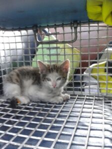 Katze aus dem Motorraum. Zuvor hatte aber die kleine Ausreißerin sich hinter einer Motorraumabdeckung versteckt und lautstark und mit ihren Krallen gegen die Rettung protestiert.