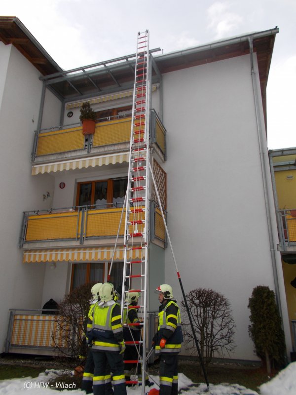 Da sich die Einsatzstelle in einem Hinterhof befand und mit der Leiter des KRF nicht das auslangen gefunden wurde mussten wir die dreiteilige Schiebeleiter des TLF 3 in Stellung bringen um die Taube zu retten.